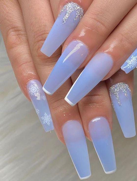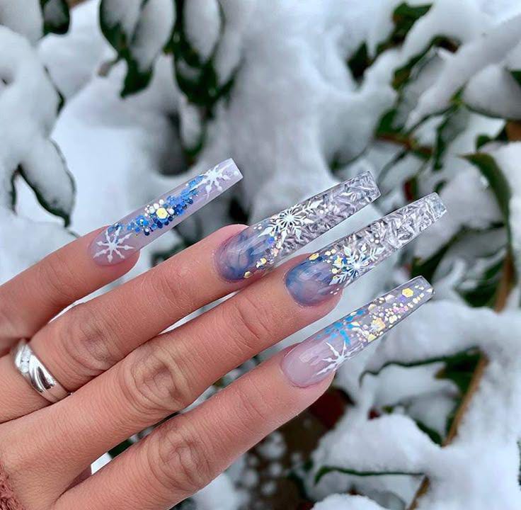 Clear and icy blue tones blend with snowflake decals and shimmering glitter, creating a frosty, crystal-like look that feels straight out of a snowy winter fairytale.
