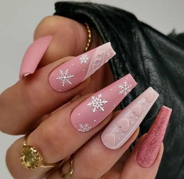 Soft pink matte polish, raised sweater-texture designs, and delicate white snowflakes make this set sweet, cozy, and perfect for a soft winter aesthetic.