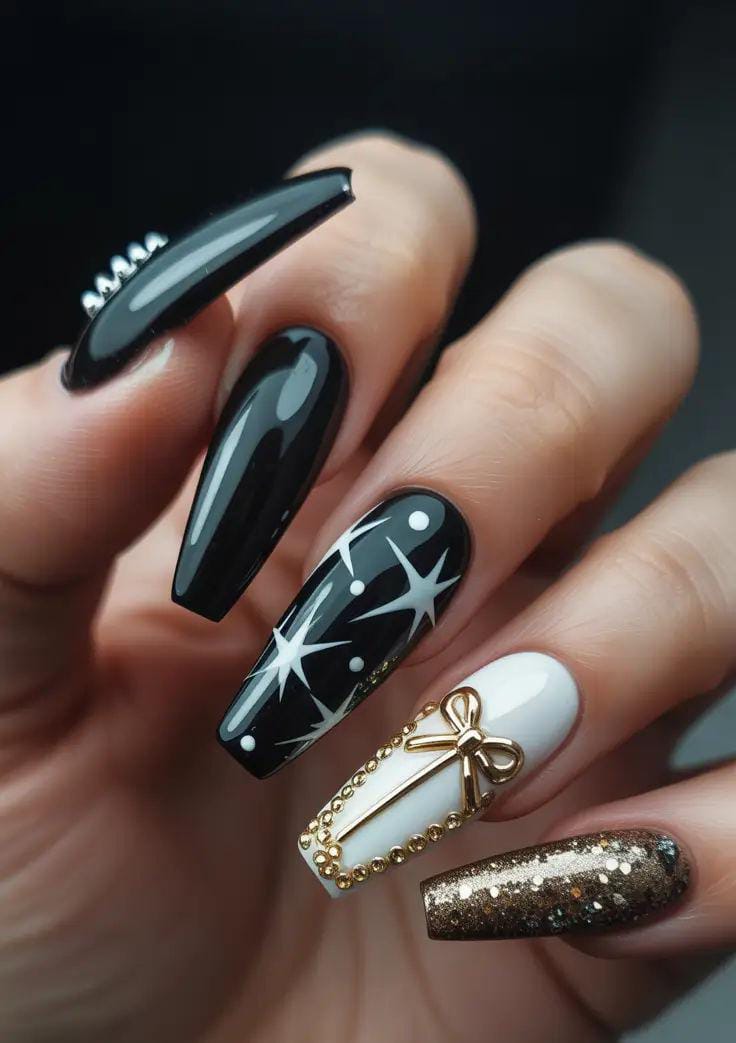Glossy black and white nails accented with star-like bursts, gold embellishments, and glitter create a glamorous, holiday-ready nighttime winter vibe.