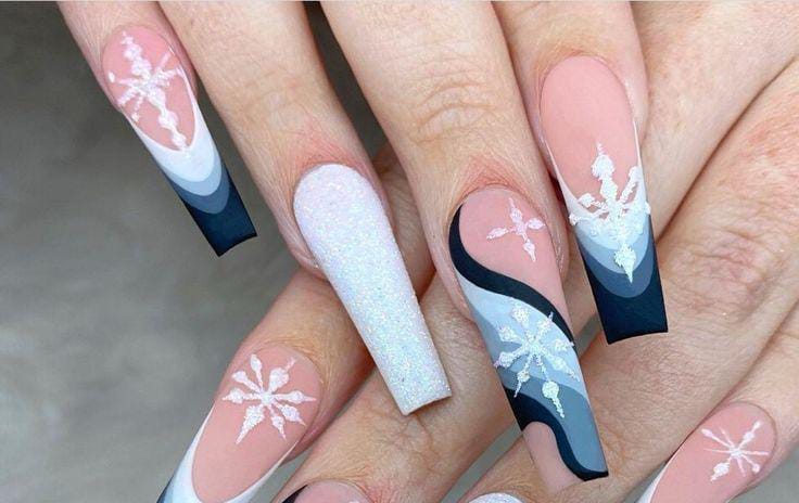 A mix of nude, navy, and icy white swirls with subtle glitter and snowflake accents makes this set modern, soft, and winter-chic.