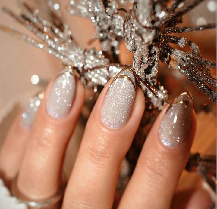 Glittery champagne nails edged with fine golden tips, giving a refined, frosty shimmer that feels both festive and elegant.