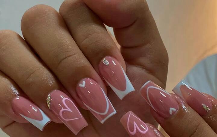 Soft pink nails with a modern French tip twist, featuring white hearts and lines for a cute, romantic feel.