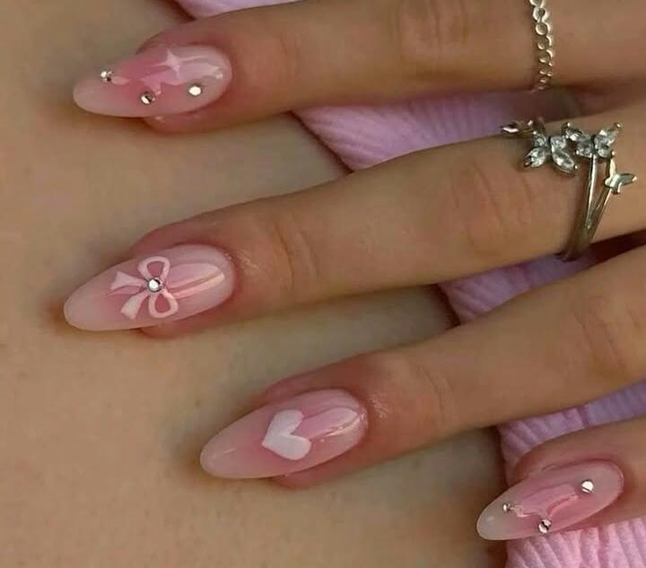 Delicate pink nails adorned with tiny bows, hearts, and rhinestones—perfect for a feminine, playful vibe.