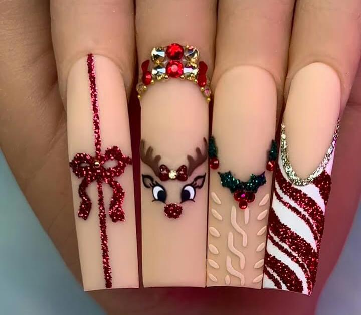 Bold holiday-themed nails in red and nude shades, decorated with glitter, reindeer art, and candy-cane stripes.