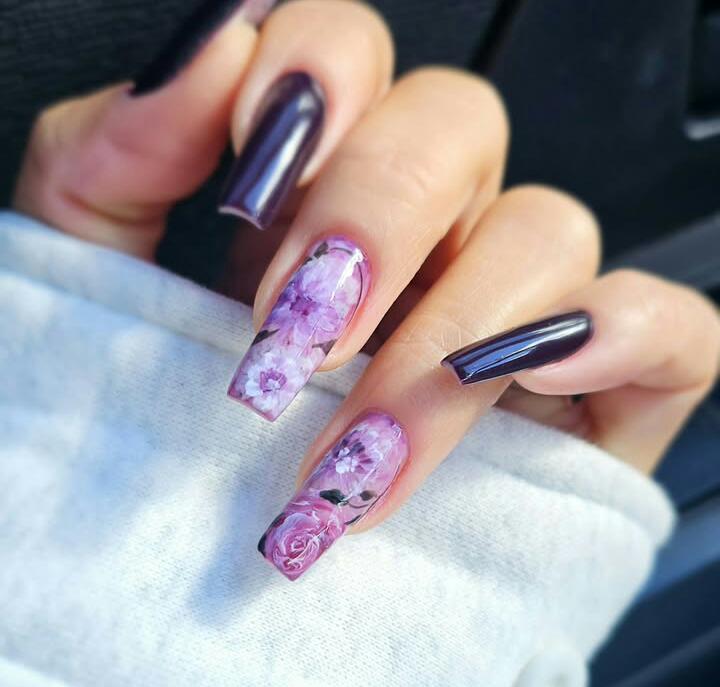 Deep plum nails paired with transparent floral accents in purple hues, creating a cozy and artistic winter garden look.