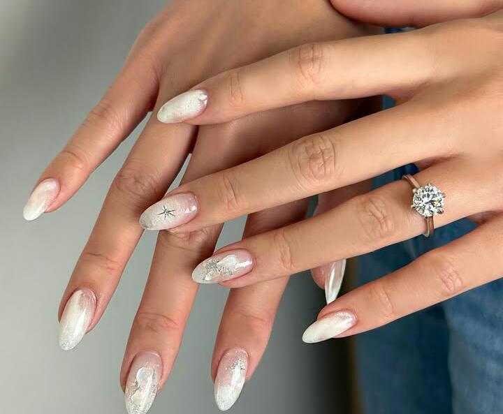 Elegant white and silver shimmer nails with subtle snowflake details — perfect for a frosty, bridal-inspired winter style.