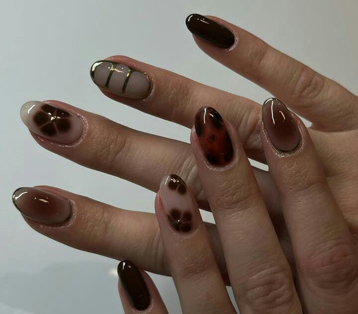 Deep chocolate brown nails paired with a soft nude accent and golden star detail, offering a warm, sophisticated winter touch.