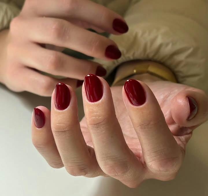 Deep, glossy red nails with a smooth, rounded finish that give a timeless, elegant winter look.
