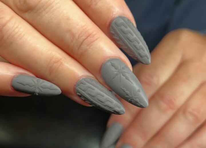 Matte grey nails with raised cable-knit textures that evoke the feel of warm winter sweaters.