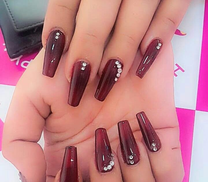 Dark burgundy coffin nails adorned with sparkling rhinestones for a bold, festive, and luxurious vibe.