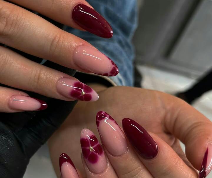 A mix of deep red and soft nude tones blended with floral patterns and glossy tips — romantic and winter-chic.