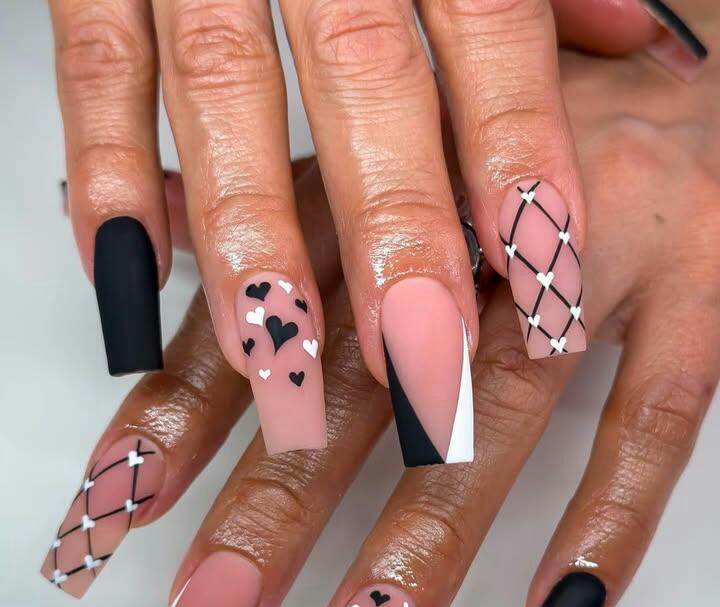 Square matte nails with black and white hearts and geometric lines — a trendy and romantic design that feels modern yet soft.