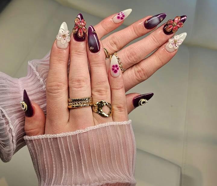 Long almond nails combining white, plum, and nude shades with 3D floral accents and gold embellishments for a statement winter look.
