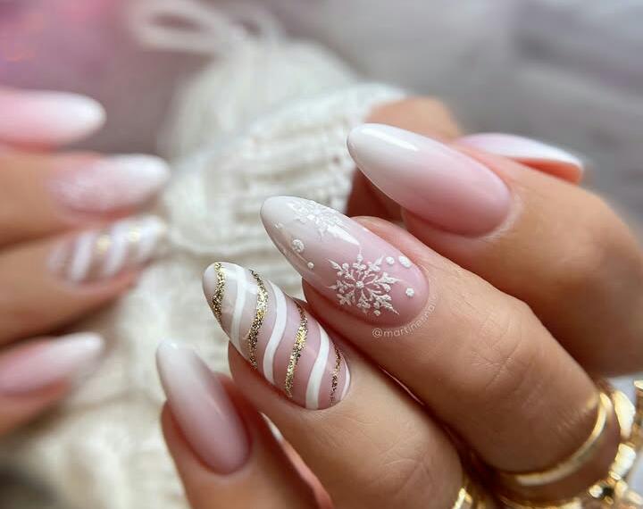 A soft pink ombré base with white snowflakes and gold-striped accents, giving a delicate and frosty winter look.