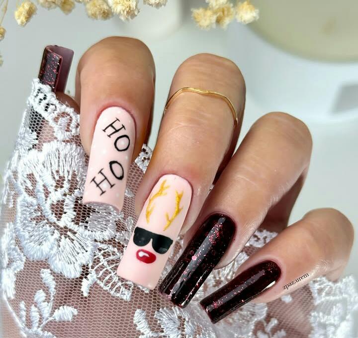 Playful nails featuring deep burgundy glitter, festive “Ho Ho Ho” lettering, and a fun character accent, perfect for holiday spirit.