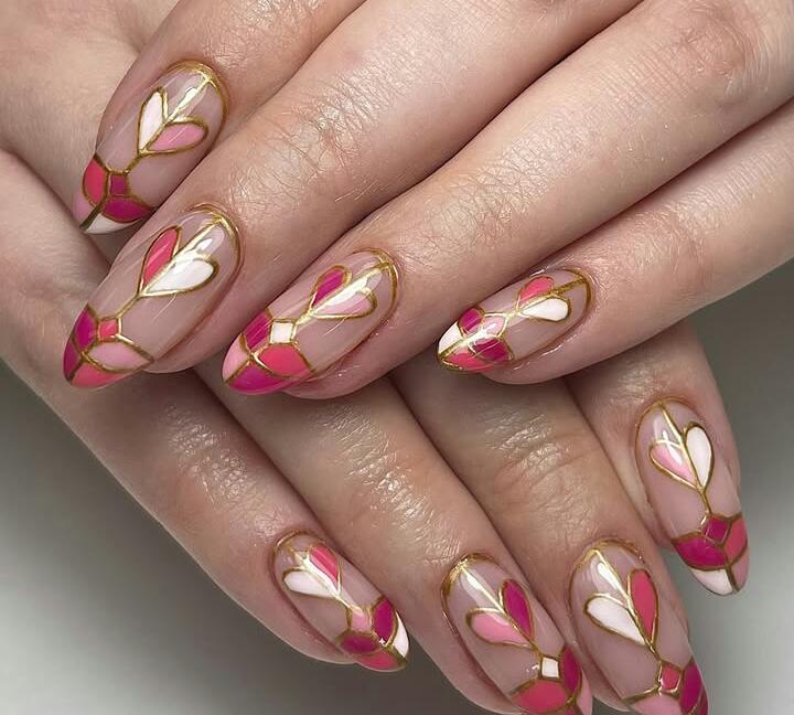 A stained-glass inspired design with pink, red, and white heart shapes outlined in gold, offering a warm and artistic winter vibe.