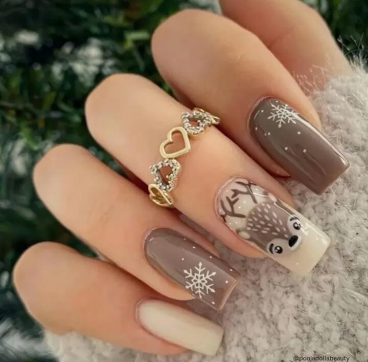 Neutral beige and taupe tones paired with snowflakes and a cute reindeer accent nail for a cozy, woodland-inspired style.