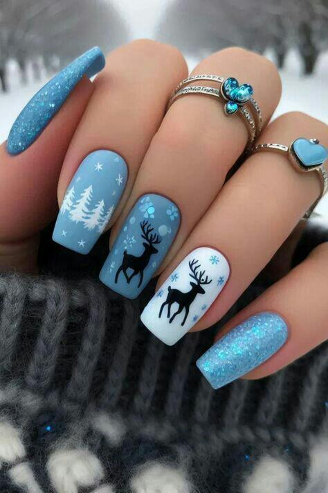 Cool blue and white nails with glitter, snowflakes, and deer silhouettes—capturing the calm beauty of a snowy forest.