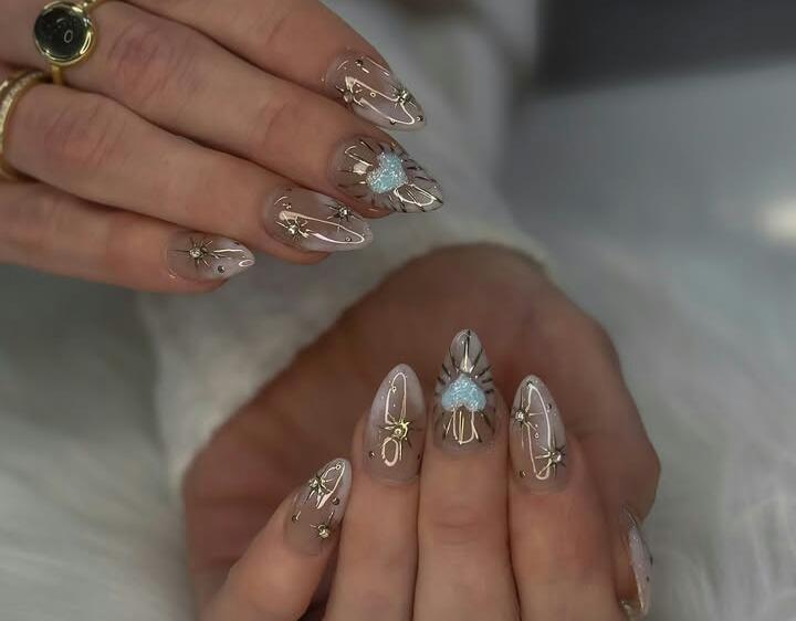 Transparent nude nails accented with icy blue hearts and gold starbursts create a celestial winter sparkle.