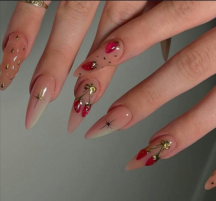 Nude almond nails adorned with red cherry art and gold details for a playful, romantic winter vibe.
