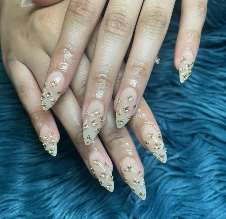 Clear, glossy nails sprinkled with tiny golden beads evoke the look of frozen dew or delicate snowflakes.
