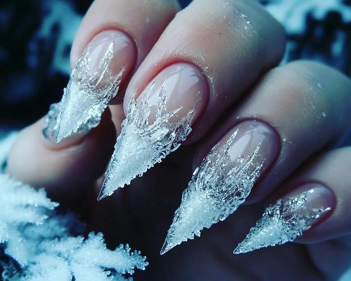 Sharp, icicle-like nails with a clear base and frosted, textured tips that resemble glistening ice shards — perfect for an icy winter fantasy look.