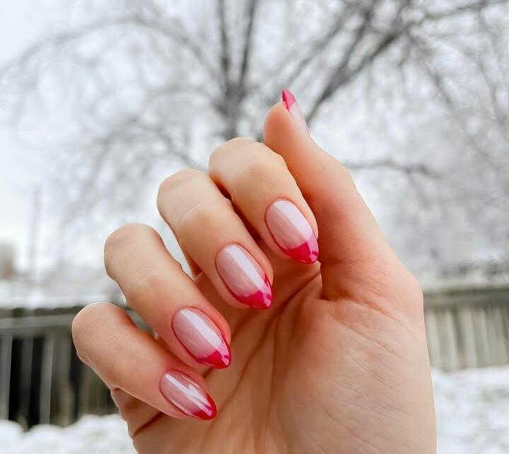 A soft nude base with deep pink angled tips, creating a fresh and modern twist on the classic French manicure with a cozy winter vibe.