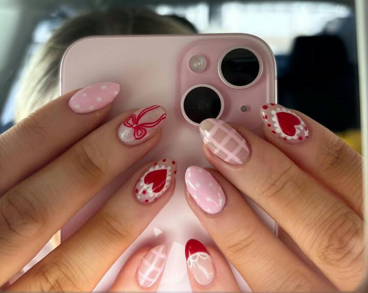 A playful mix of pink and red Valentine-inspired designs featuring hearts, bows, dots, and checks for a charmingly cute, festive winter look.