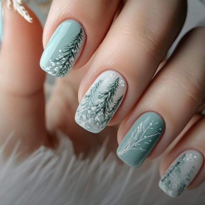Soft sage green and white nails with delicate hand-painted pine trees and snowy details that feel calm and wintry.