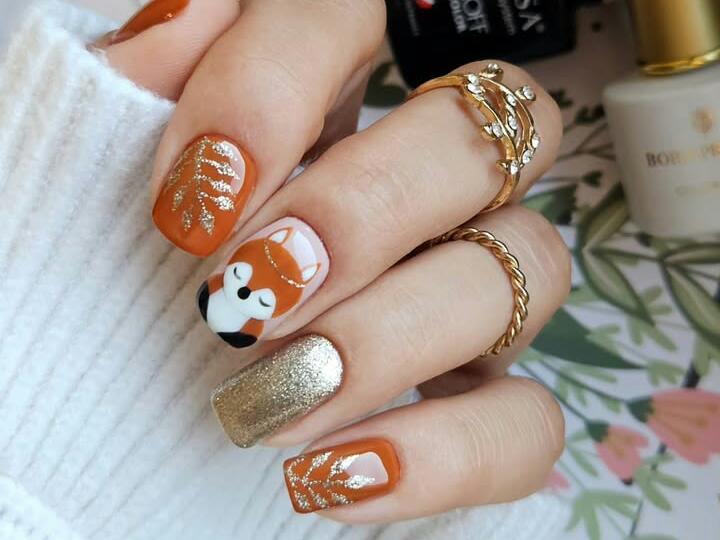 Warm orange tones paired with gold glitter and leafy accents, highlighted by a cute fox design — giving a cozy woodland-in-winter aesthetic.