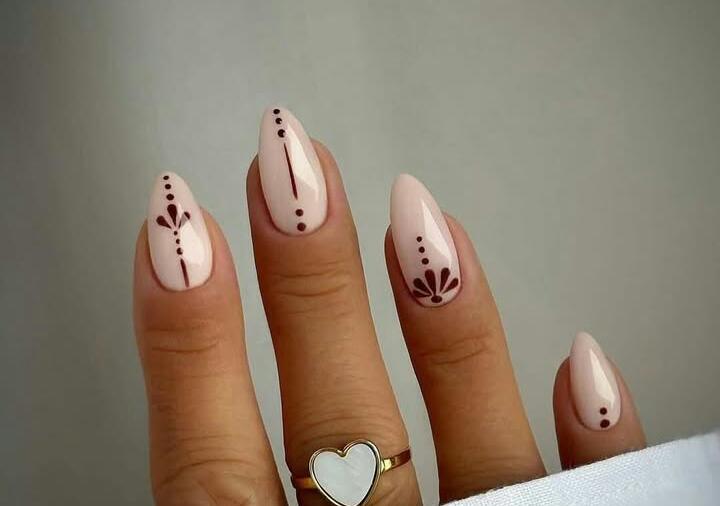Elegant nude nails with fine maroon dotted lines and delicate minimalist patterns, creating a refined, winter-ready simplicity.