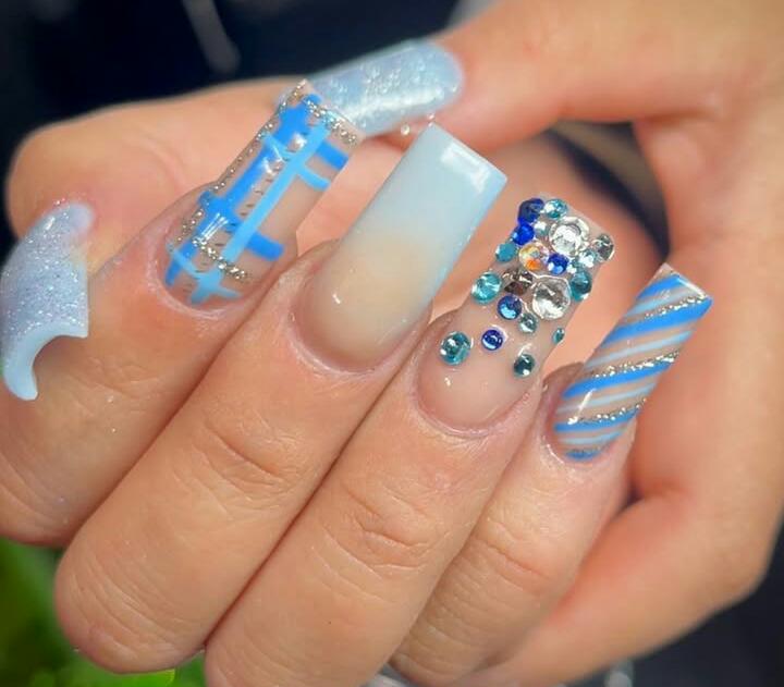 A smooth gradient of blues swirled in a wave pattern on a nude base, giving off a cool, ocean-meets-winter elegance.