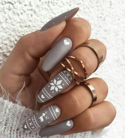Soft matte gray nails decorated with white Nordic-inspired patterns and tiny hearts, giving a cozy, winter-sweater vibe.