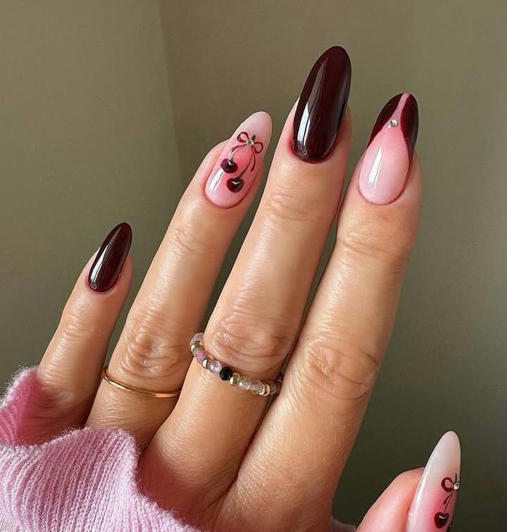 Deep burgundy nails paired with delicate cherry art on a blush base—sophisticated with a sweet, playful touch.
