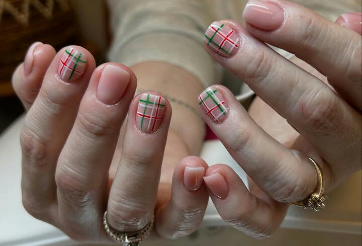 Short nude nails decorated with red and green plaid lines, giving a cozy, festive feel perfect for the holiday season.