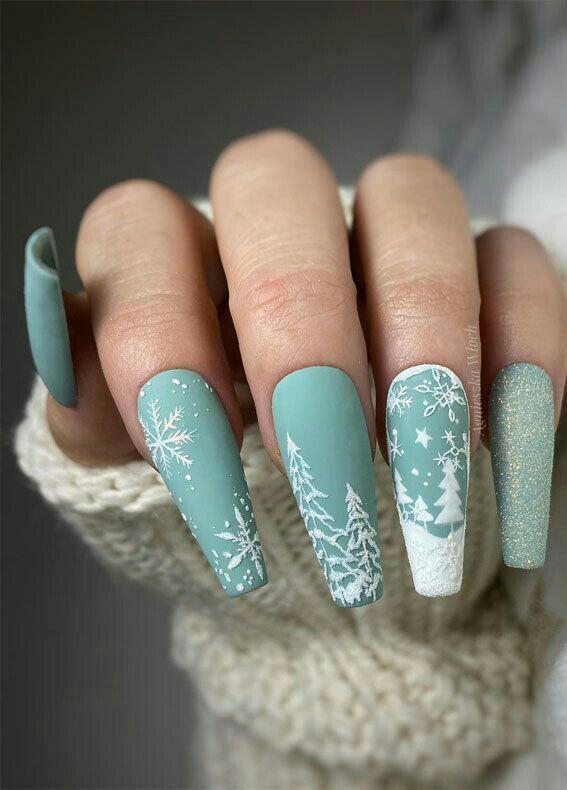 Matte mint-blue nails with white snowflakes and pine trees evoke a peaceful, snowy landscape.
