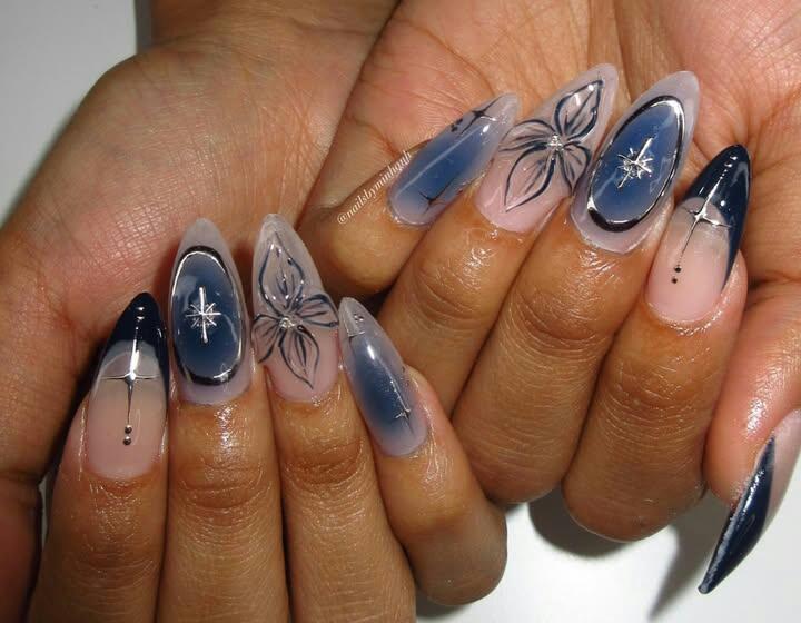 Dark blue ombré nails with celestial-inspired florals and stars, creating a dreamy, winter-night sky look.