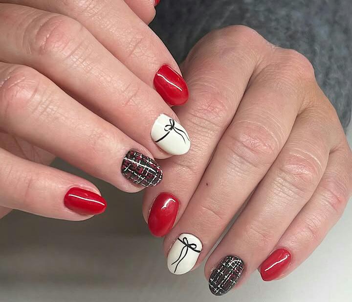 Short red and white nails accented with plaid and bow details — a cozy, holiday-inspired design that feels like unwrapping a present.