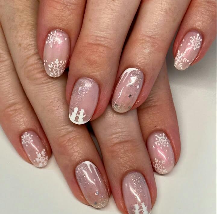 Soft pink and white nails with glitter and snowflake art, giving a delicate, frosty sparkle reminiscent of freshly fallen snow.