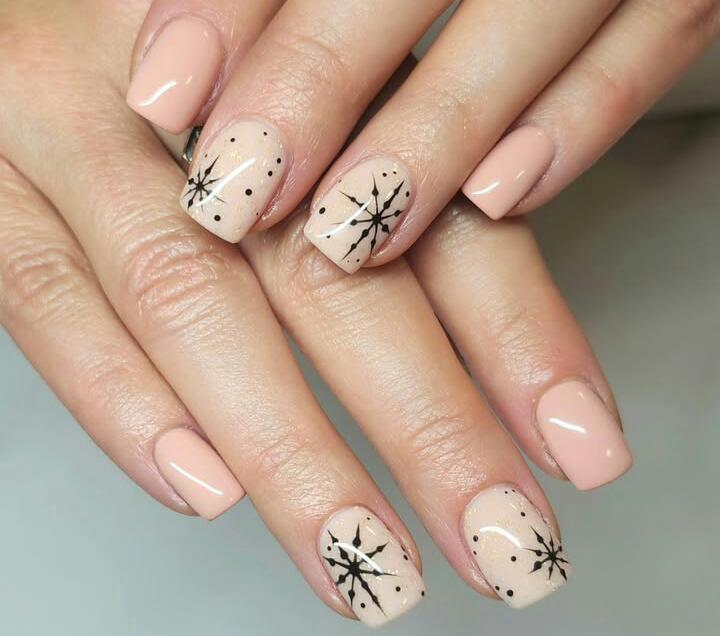 A soft nude manicure with delicate black starburst patterns and scattered dots, creating a chic, wintry sparkle.