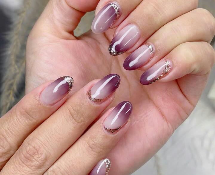 A smooth gradient of purple fading into a clear base, finished with silver glitter edges for a frosty, elegant finish.