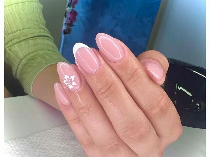 A classic pink French manicure with a modern twist, featuring a white floral accent that feels fresh and delicate.