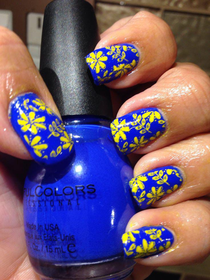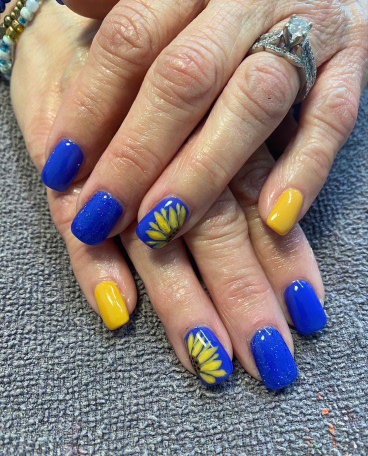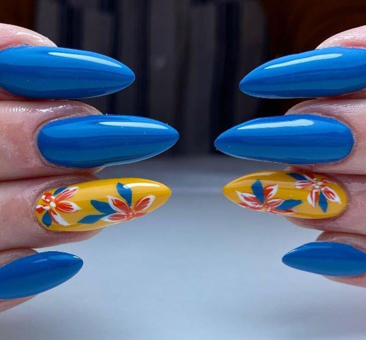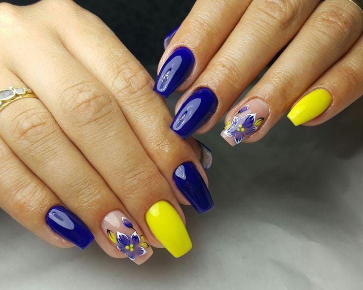 A striking mix of deep blue and bright yellow nails, paired with a floral accent nail that adds a touch of spring elegance. This design is both vibrant and stylish.