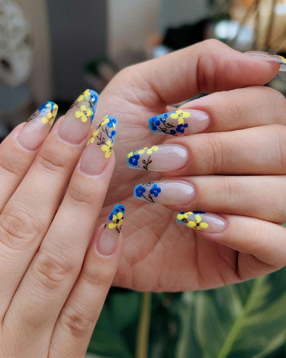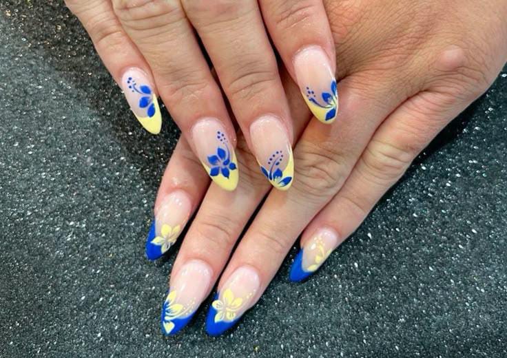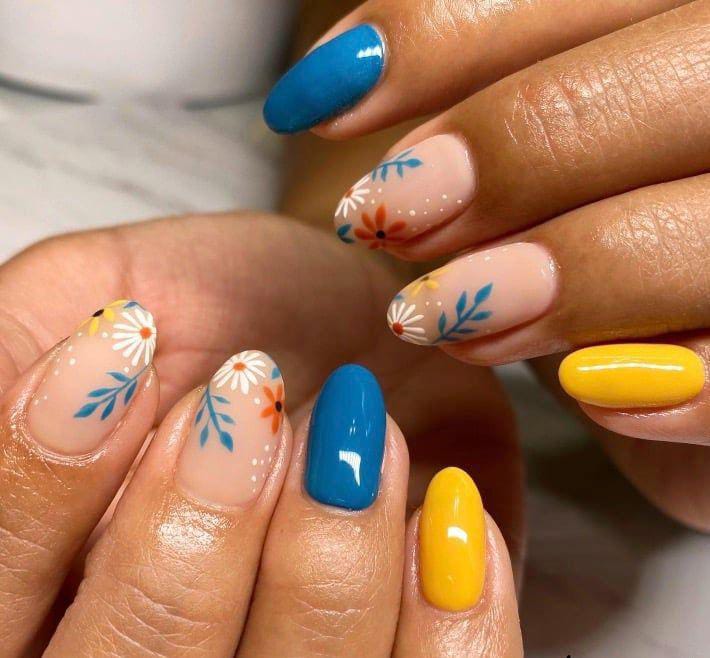 Bright yellow and blue nails dominate the look, with some nude nails featuring colorful floral art in a mix of yellow, blue, and soft greens. It’s lively and perfect for spring.