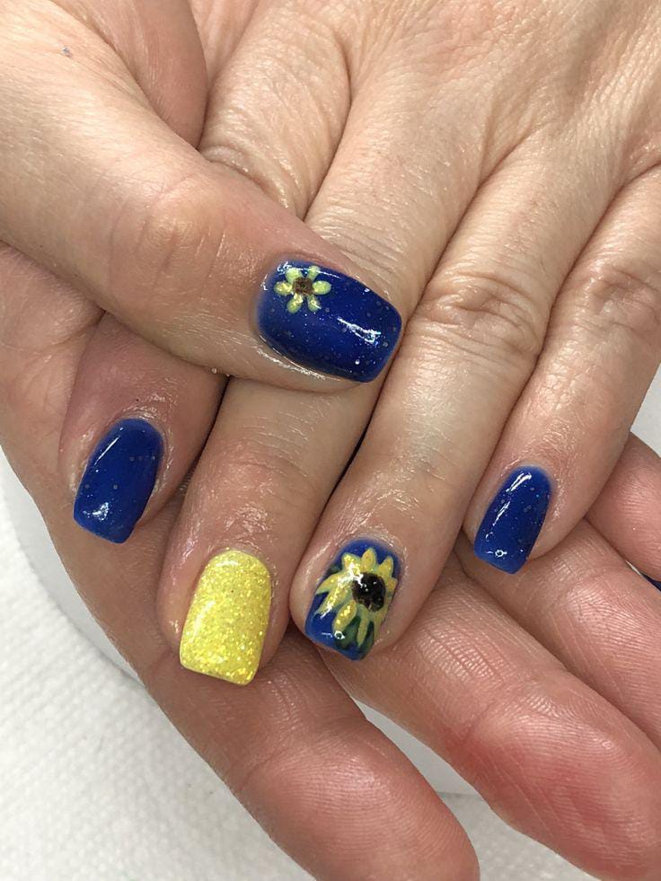 Deep blue nails are paired with a sparkling yellow accent nail, featuring a stunning sunflower design. The combination of rich blue and sunny yellow captures the essence of spring, making it an elegant and cheerful design.