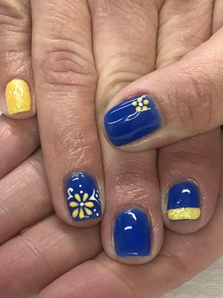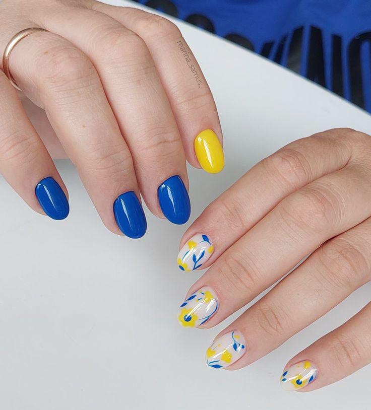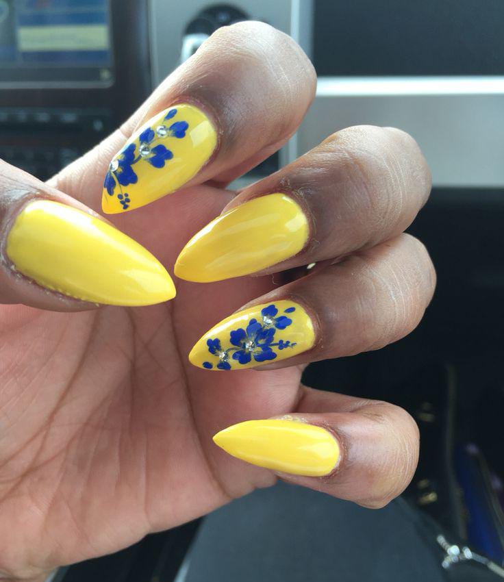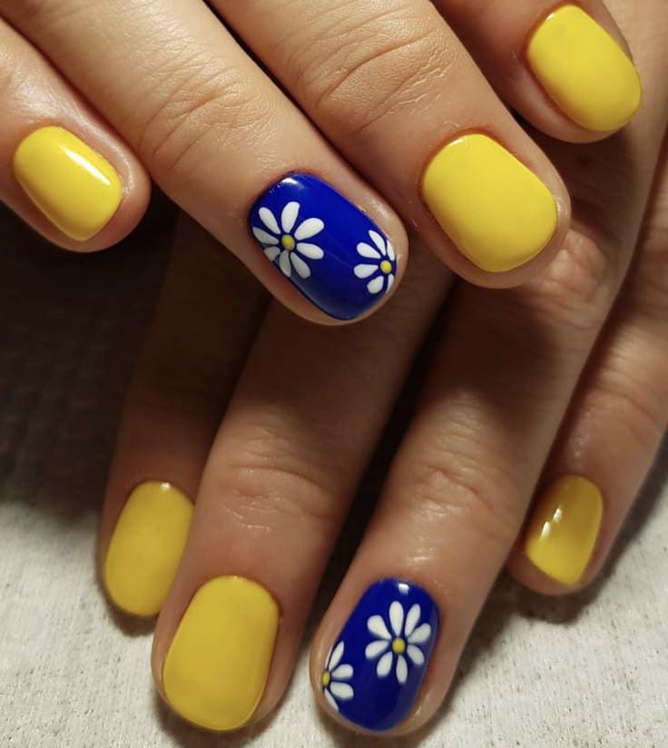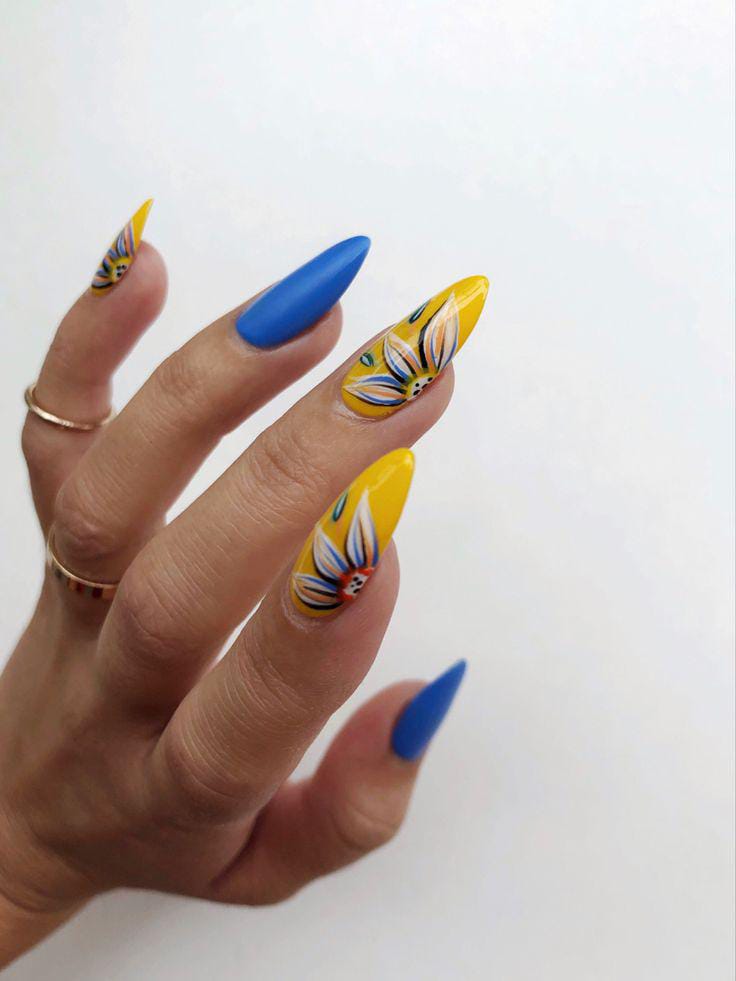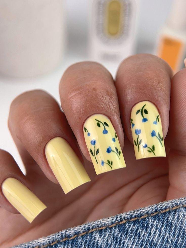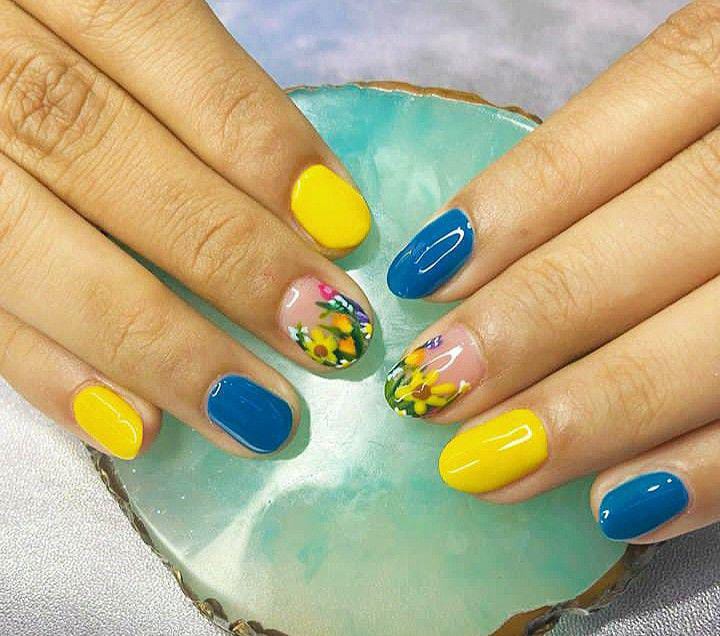 A bright and bold mix of yellow and blue with a touch of artistry. Yellow nails are paired with blue floral nail art, creating a lively, contemporary spring vibe.