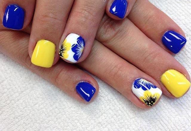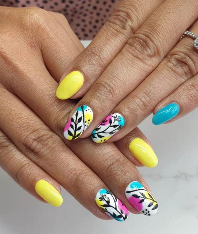 Bright yellow and blue nails with pops of colorful floral patterns featuring pink, blue, and black on white base. This design creates a cheerful and lively look perfect for spring.