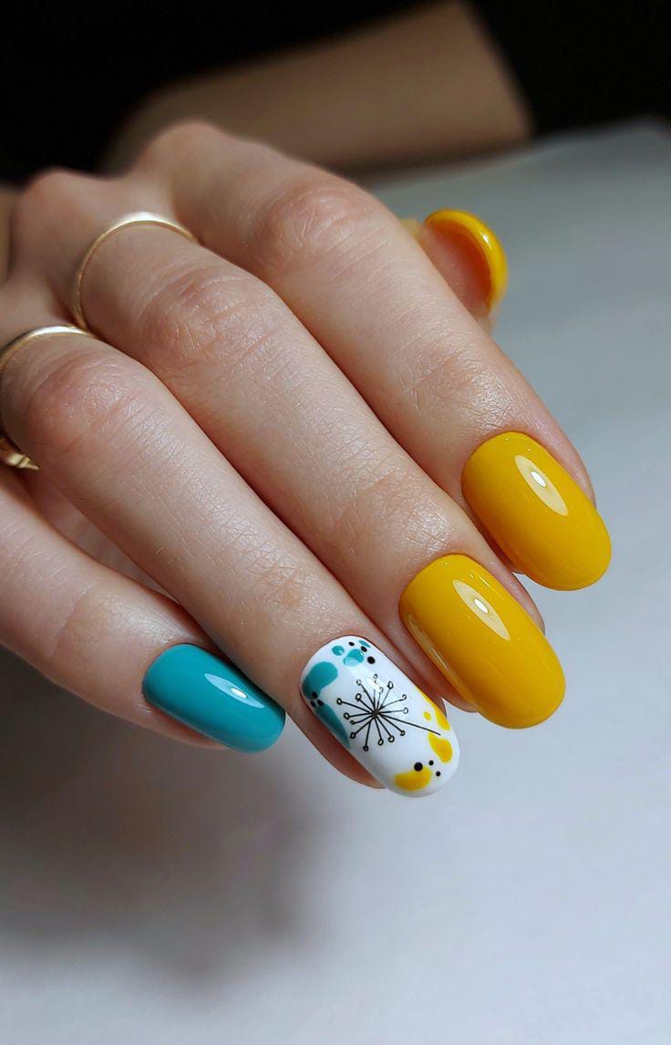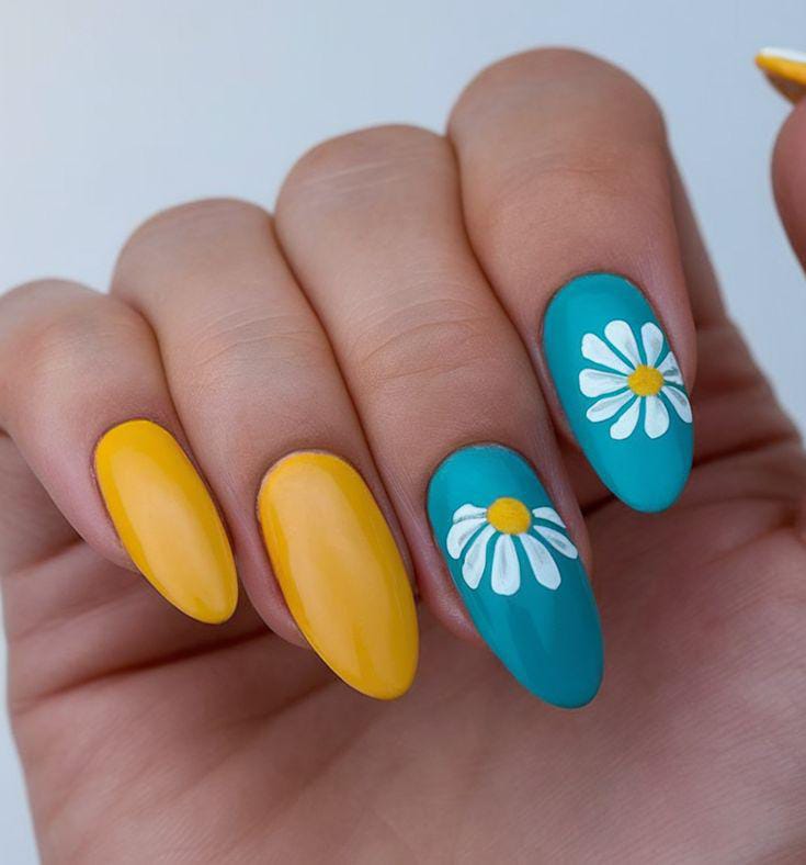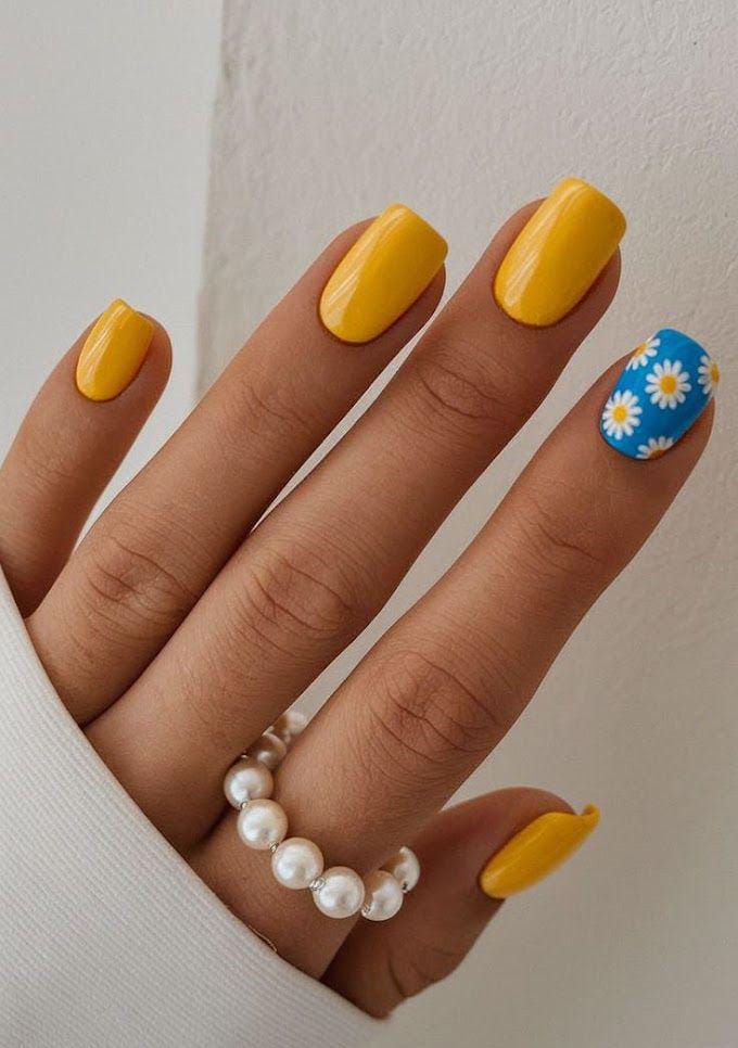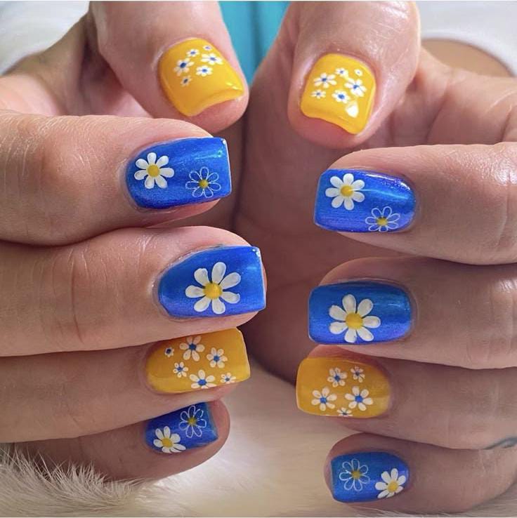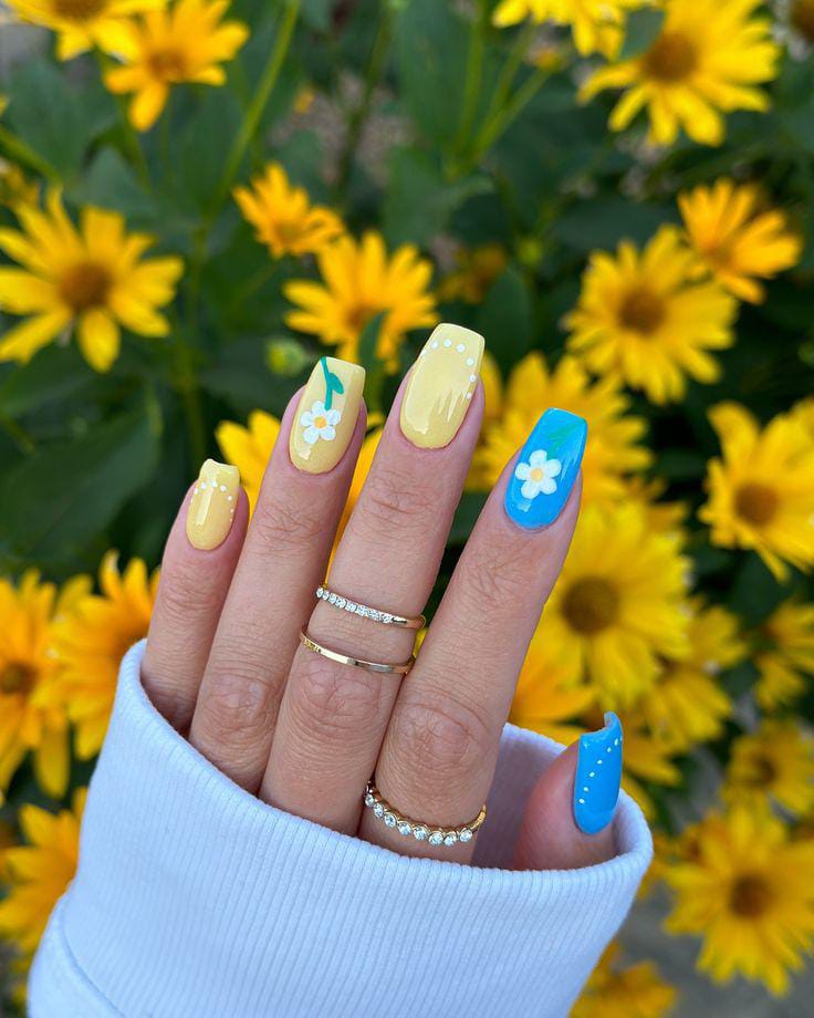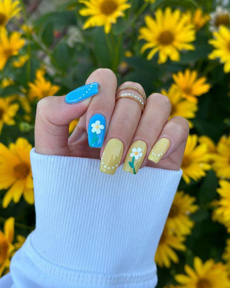 This design combines vibrant yellow and blue, with bold floral accents. The yellow nails are paired with turquoise blue nails that feature a cute daisy design, perfect for a cheerful spring look.