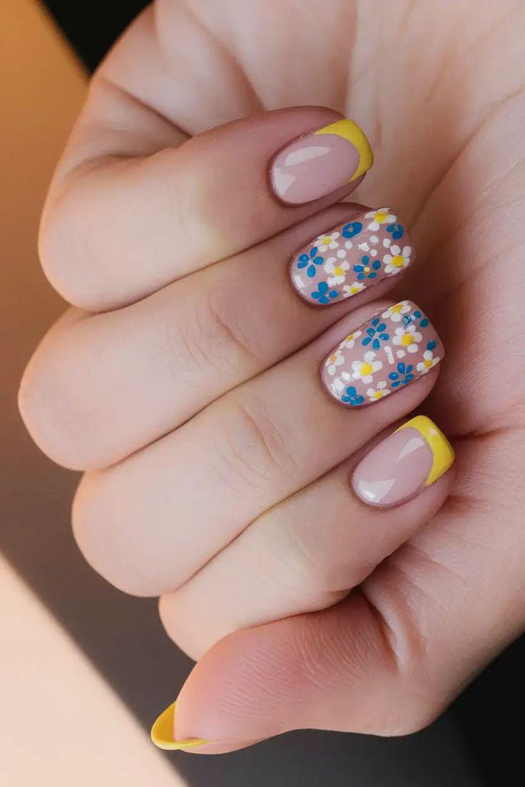 A nude base with yellow tips with blue and white floral accents . The design is subtle yet playful, capturing a sophisticated spring aesthetic.