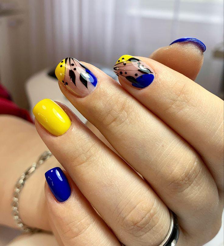 Bold yellow and blue nails paired with contrasting blue and black patterns subtle dots, giving an edgy and modern spring vibe. It’s perfect for someone looking for a bold, graphic style.